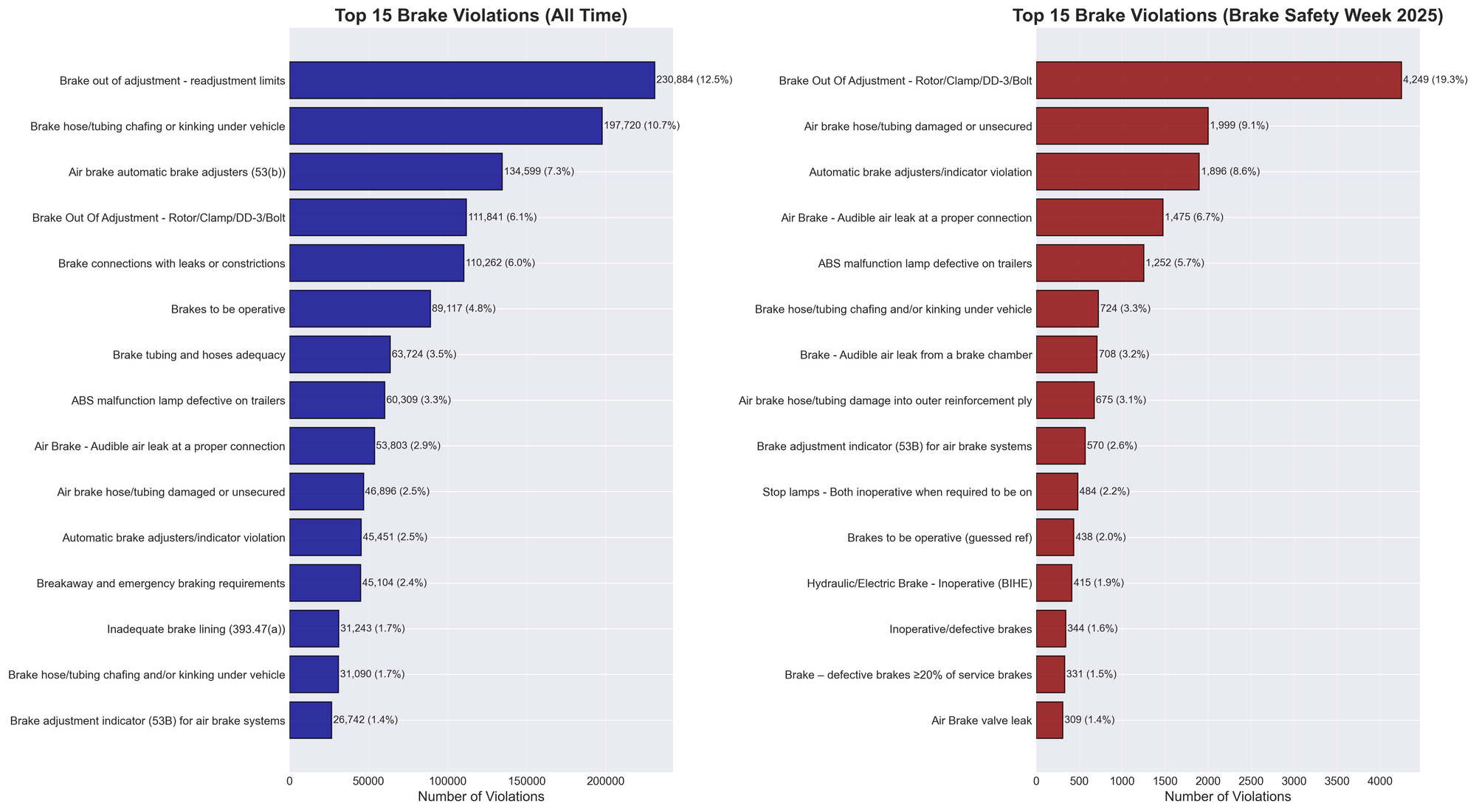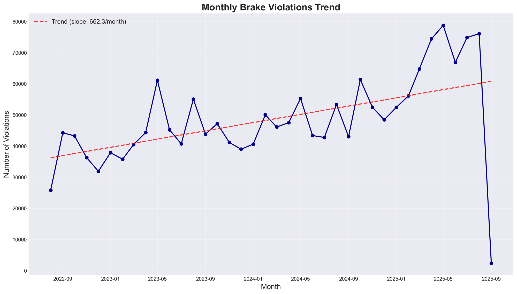 Brake violations have been trending upward over the past three years. Monthly violations now average 59,101, compared to 45,808 in the previous 12-month period—a 29% increase year-over-year.