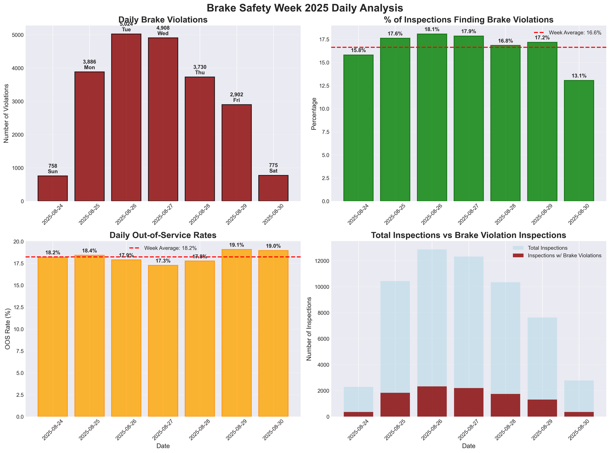 Inspectors documented 21,983 brake violations during Brake Safety Week 2025, averaging 3,140 violations per day. This represents a 31.1% increase from the typical daily average of 2,395 violations seen over the previous two years.
