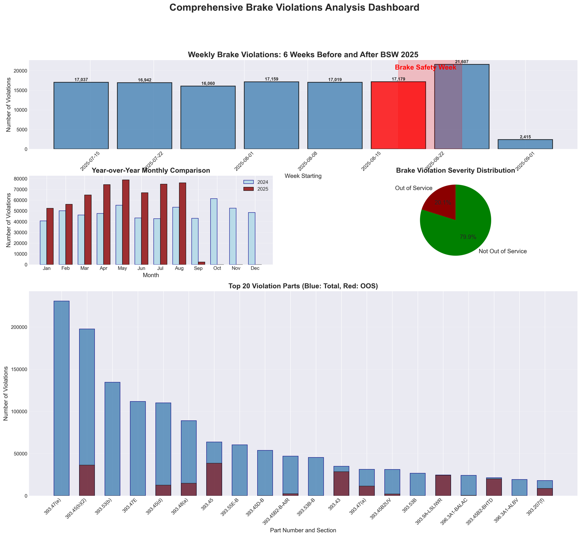 Brake Safety Week 2025's 21,983 violations represent a ~60% increase from Brake Safety Week 2024, which recorded approximately 13,500 violations during August 25-31, 2024. This year-over-year increase during the focused enforcement week significantly exceeds the overall 29% annual increase in brake violations.