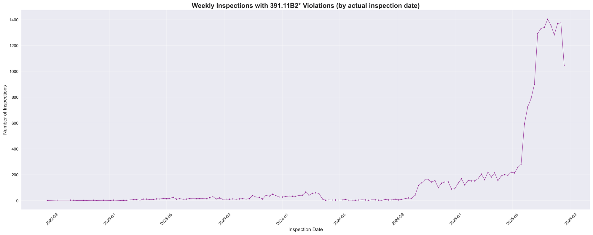 Early 2025: Weekly violation counts begin climbing dramatically, reaching over 1,000 per week by mid-2025.