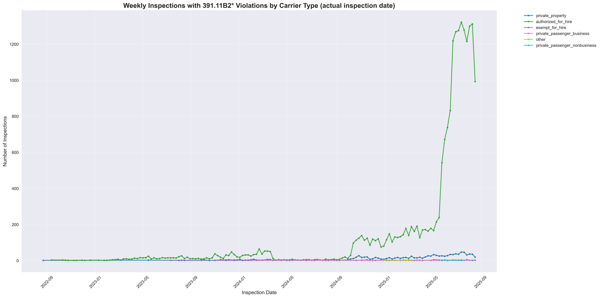 Weekly inspection data reveals distinct patterns by carrier type, with the overall enforcement surge driven primarily by authorized for-hire carriers, which represent 90.2% of all violations (20,074 violations). The temporal charts show dramatic increases beginning in early 2025, with weekly violations climbing from stable levels under 200 per week to peaks over 1,300 per week by summer 2025.