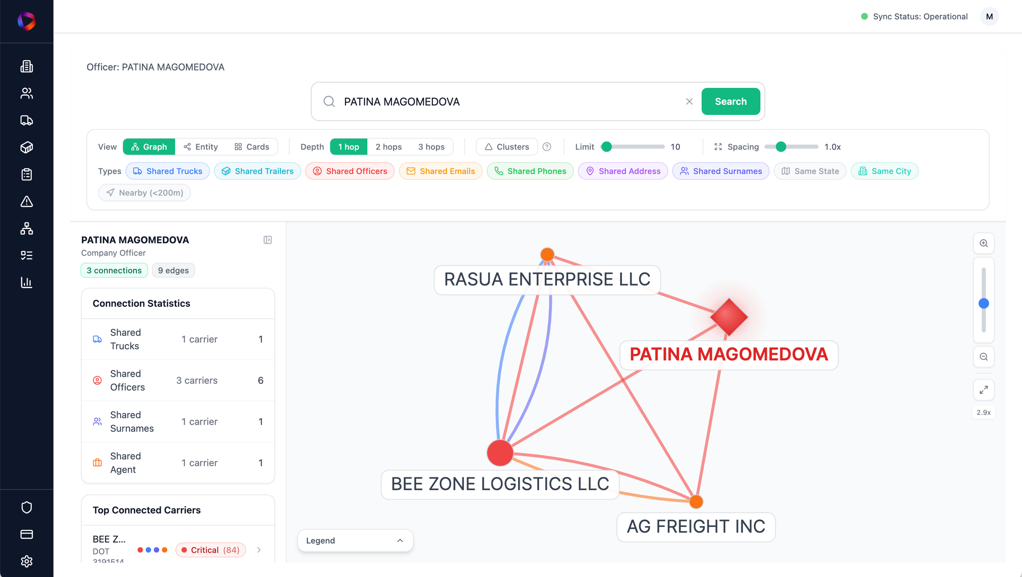 In an isolated spreadsheet, an officer’s name is just a string of text. But on a network graph, a person becomes a central node. We ran a new query through the entirety of the FMCSA database: What other companies is Patina Magomedova connected to?